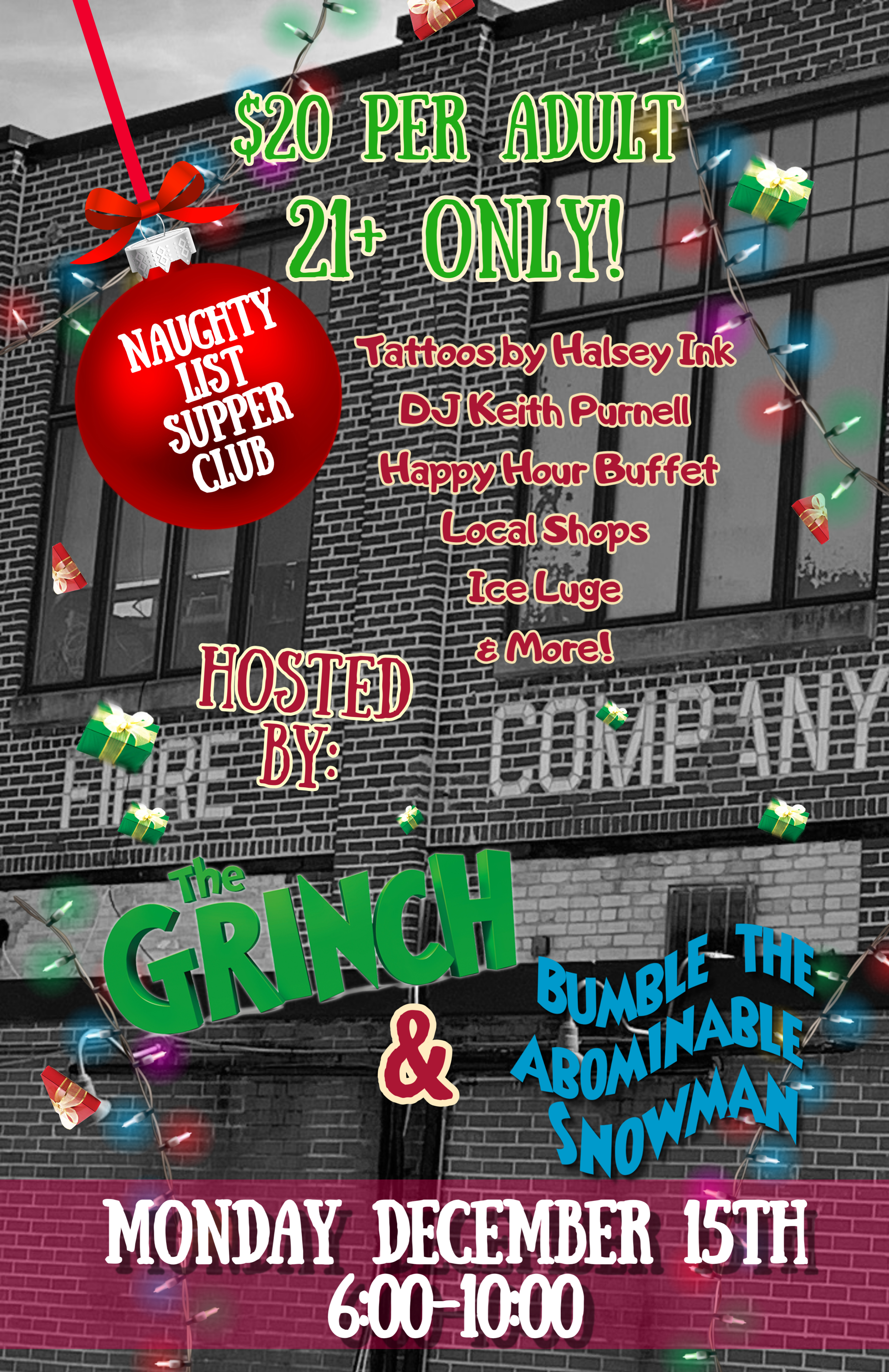 Naughty List Supper Club: Hosted by Grinch & Bumble is our adults-only holiday takeover—equal parts festive, mischievous, and outrageously fun. Guests will enjoy a full dinner buffet loaded with seasonal favorites, sip on specialty holiday cocktails, and explore unique offerings from local shops. A live tattoo artist will be on-site for those looking to commemorate the night with something a little extra, while music, surprises, and plenty of Grinch-and-Bumble antics keep the vibe lively from start to finish. If you’ve ever wanted to party on the Naughty List… this is your night. 21+ only each ticket includes a drink ticket to get your night started!